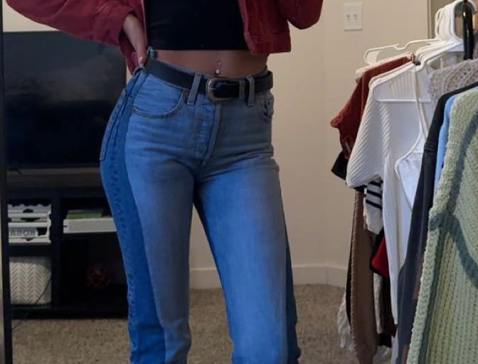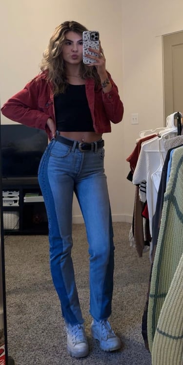 The black cropped tank creates a sleek, minimal base, while the light wash jeans keep the look relaxed and easygoing. The cropped red jacket adds a bold pop of color and just enough attitude, giving the outfit that standout, bar-ready edge. A black belt ties everything together, and the white platform sneakers keep it casual with a modern twist.