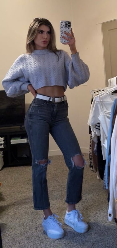 The cropped cable-knit sweater brings a soft, laid-back warmth, while the distressed medium-wash jeans add a touch of grit and everyday authenticity. A white belt and white platform sneakers brighten the look and give it a clean, modern finish that keeps the outfit feeling fresh and balanced.