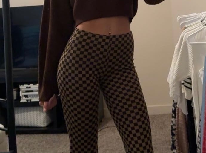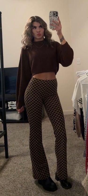 The cropped brown sweater brings softness and warmth, creating a relaxed silhouette that contrasts perfectly with the brown checkerboard flare pants, adding movement and a retro-inspired Western twist. The darker tones keep it cohesive, while the flared shape adds just enough drama. Black boots ground the look, giving it weight and a subtle edge that balances the softness up top.