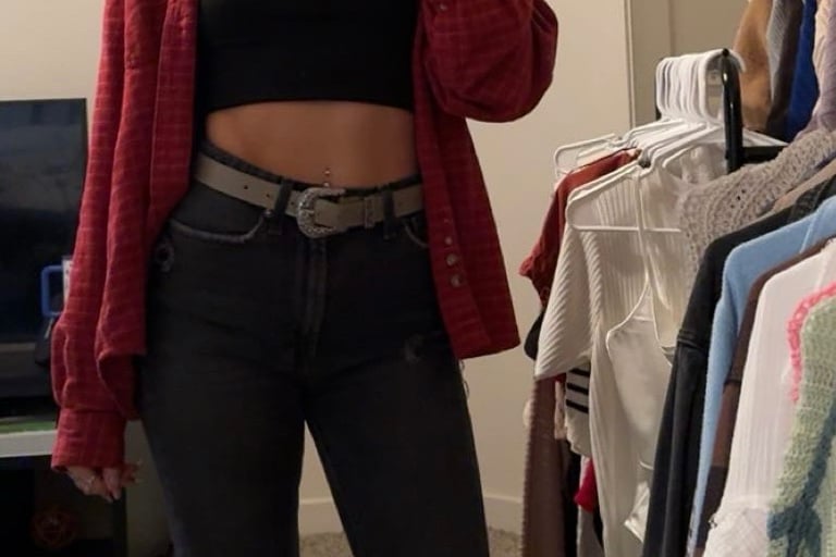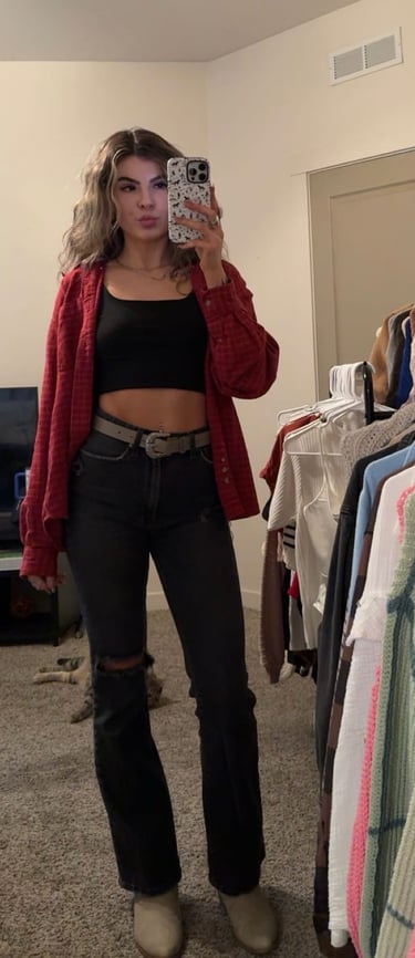 The black cropped tank keeps the base simple and sleek, while the black jeans add a worn-in, lived-in feel that gives the outfit its edge. The red flannel layered over top brings that classic Western grit and a pop of color that feels both bold and familiar. A statement belt adds detail and structure, while the tan cowgirl boots ground the look in timeless country style.