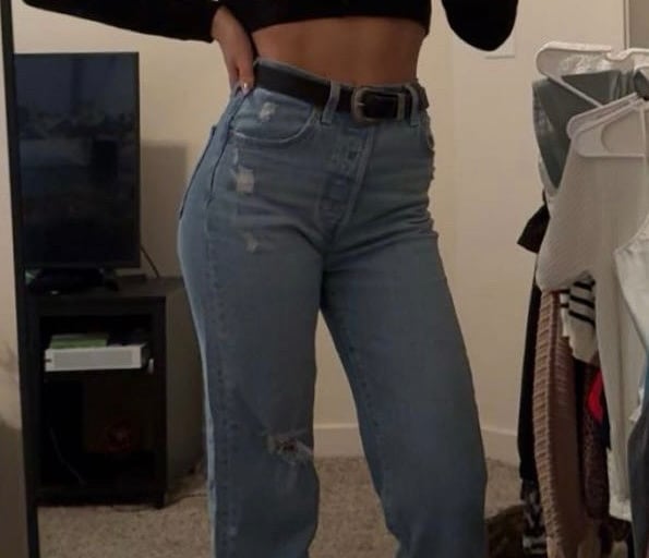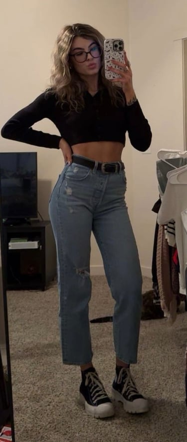 The black long sleeve cropped top creates a sleek, fitted base, while the light wash distressed jeans add a relaxed, lived-in feel that keeps the look grounded. A black belt ties it together with subtle structure, and the black and white platform Converse bring in a casual, slightly edgy twist that feels both current and timeless.