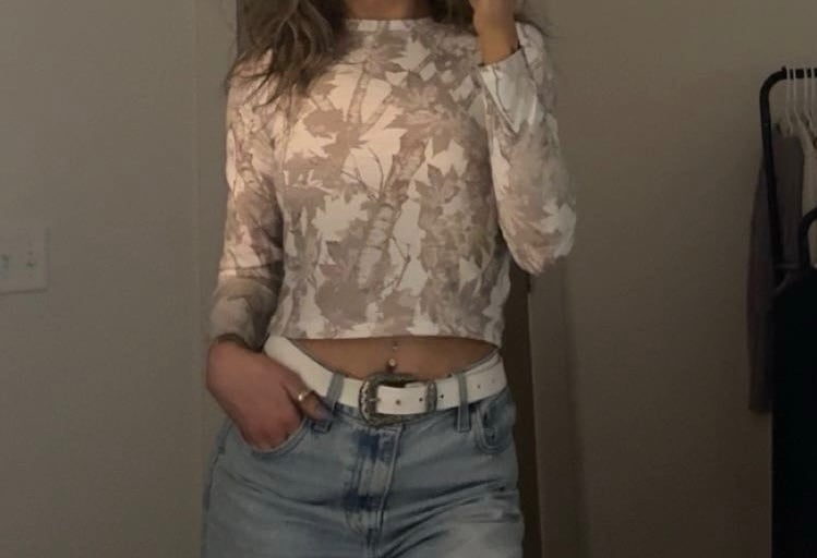 The long sleeve neutral camo top brings a soft, feminine touch with its subtle pattern, while the light wash wide-leg jeans keep the outfit grounded and effortlessly casual. A white belt adds a clean contrast and pulls the look together, giving it that polished but easy finish. The overall combination feels natural and unforced—just like the vibe of the song.