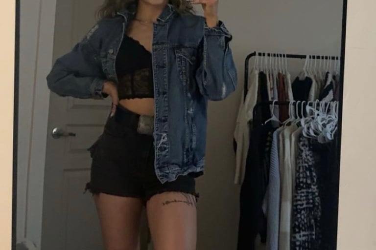 The black lace crop top adds a touch of sultry detail while keeping the look sleek and feminine. Paired with black distressed shorts, it creates a confident, leg-lengthening silhouette that feels both edgy and effortless. The denim jacket layered on top brings in that classic Western texture, balancing the boldness with something timeless. A statement belt adds structure and attitude, while the black cowgirl boots ground the look with undeniable country power.